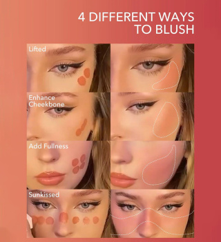 تکنیک توزیع: مقداری از رژگونه را به پشت دست بزنید، سپس با انگشتان آن را برداشته و با حرکات ضربهای آرام روی گونهها پخش کنید.
